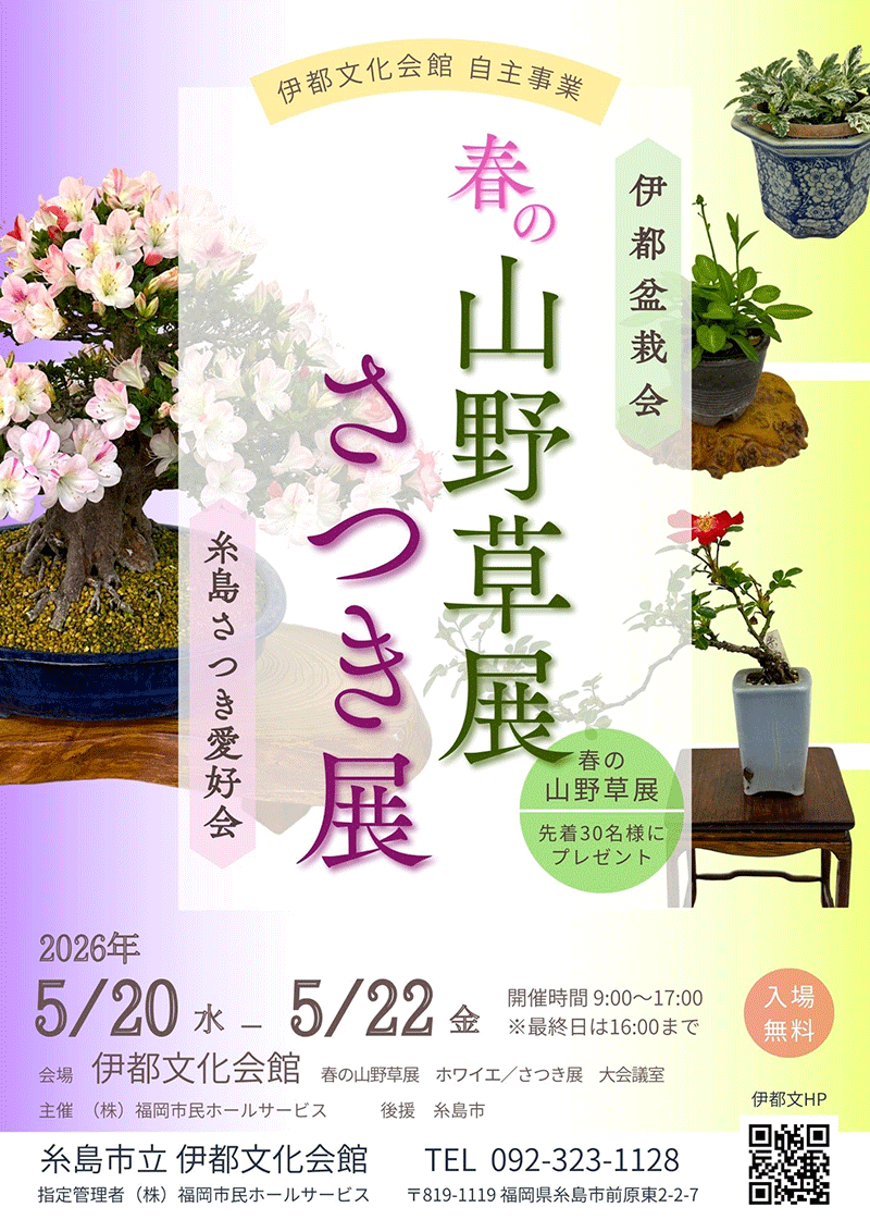 2026年4月19日 / 最終更新日 : 2026年4月19日 wpmaster 催し物案内 春の山野草展 さつき展 2026年5月20日(水)~5月22日(金) 開催時間9:00~17:00最終日は16:00まで開催場所★さつき展(大会議室)★山野草展(ホワイエ)先着30名様にプレゼント